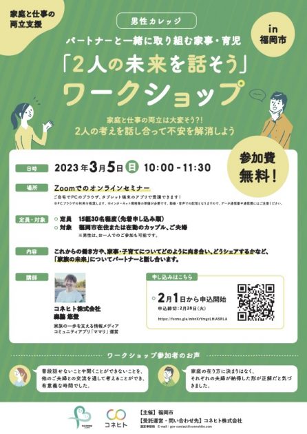 コネヒト株式会社(本社:東京都港区、代表取締役 高橋 恭文、以下「コネヒト」)は、家庭と仕事の両立支援を目的に、パ ートナーと一緒に取り組む家事・育児をテーマとする「2人の未来を話そう」ワークショップを福岡市から受託し、3月5日(日)にオンラインにて開催することをお知らせいたします。