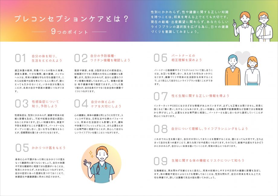プレコンセプションケアに関する「9つのポイント」や自身の健康状態を確認する「プレコンチェックシート」、やせ・肥満の課題と現状をグラフを用いながら解説したデータなど、オリジナルで制作したパンフレットを無料でお渡ししています。
