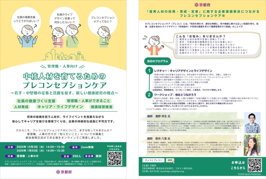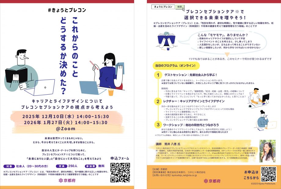 コネヒトは京都府とともに、このプレコンセプションケアの普及啓発を通じて、社会人(20~30代)の「主体的な未来の選択」と、企業の「人材採用・育成・定着」という双方のゴールを見据えて、本セミナーおよびワークショップを開催いたします。