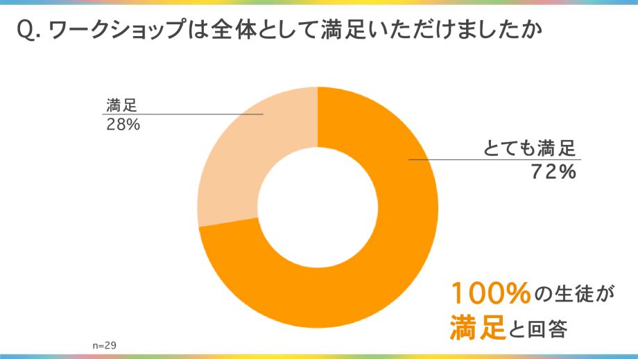 参加者全員がワークショップ全体に「とても満足」(72%)または「満足」(28%)と回答しました。