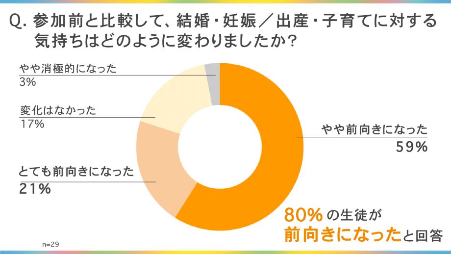 80%の生徒(「とても前向きになった」21%、「やや前向きになった」59%の合計)が、結婚・妊娠/出産・子育てに対する気持ちが参加前と比較して前向きになったと回答しました。