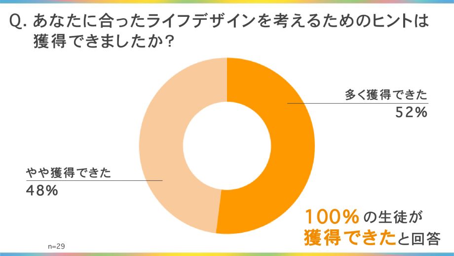 参加者全員が「自分に合ったライフデザインを考えるためのヒントを獲得できた」と回答しました。